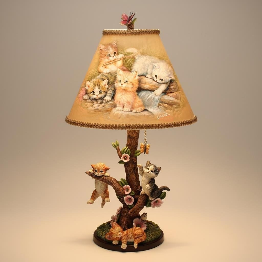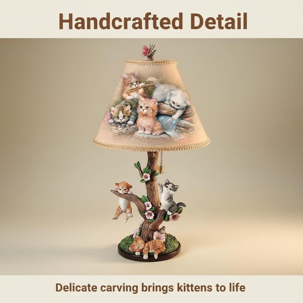 The lamp base features a tree-inspired sculptural design, where several adorable kittens are playfully exploring branches and the forest floor.